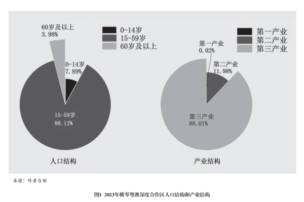 首先,橫琴粵澳深度合作區(qū)經(jīng)濟運行總體態(tài)勢良好。人口結(jié)構(gòu)持續(xù)優(yōu)化,綜合實力快速提升。截至2024年9月,合作區(qū)常住人口約為4.8萬人,年人口增長率穩(wěn)定在8%左右。人才政策的精準性使橫琴在吸引高端人才方面具有獨特優(yōu)勢,使得橫琴人口結(jié)構(gòu)呈現(xiàn)出青年化、受教育程度高的顯著特征,主要表現(xiàn)為港澳高學歷人才集聚效應明顯。第七次全國人口普查數(shù)據(jù)顯示,橫琴15~59歲的常住人口占總?cè)丝诘?8%,大學(大專及以上)常住人口占總?cè)丝诘?1%。澳資企業(yè)從業(yè)人數(shù)12837人,港澳居民在合作區(qū)跨境執(zhí)業(yè)專業(yè)人士數(shù)1400人。產(chǎn)業(yè)結(jié)構(gòu)契合發(fā)展定位,區(qū)位優(yōu)勢顯著。地區(qū)生產(chǎn)總值從2009年2.85億元增至2023年472億元。第一產(chǎn)業(yè)占比僅約0.02%,第二產(chǎn)業(yè)占比約12%,第三產(chǎn)業(yè)高度發(fā)達、占比約88%,是典型的現(xiàn)代服務業(yè)導向型產(chǎn)業(yè)結(jié)構(gòu)。橫琴的服務業(yè),特別是金融、旅游、文化創(chuàng)意、科技服務等行業(yè),占據(jù)了經(jīng)濟發(fā)展主導地位。這與橫琴作為自貿(mào)區(qū)、合作區(qū)的定位高度契合,政策支持、優(yōu)越的區(qū)位優(yōu)勢以及金融政策推動了服務業(yè)的快速發(fā)展(見圖1)。