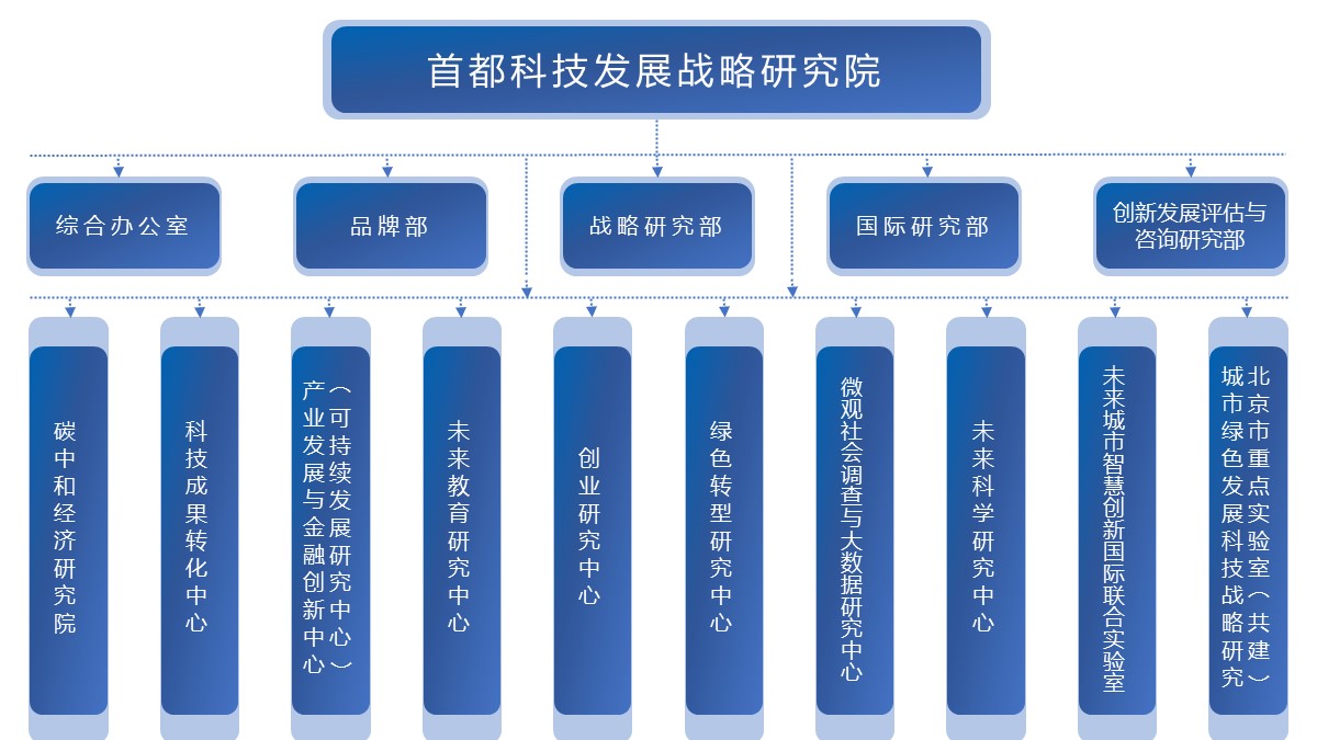 ? ? ? 首都科技發(fā)展戰(zhàn)略研究院按照首都特色新型智庫建設要求,根據(jù)研究和工作需要,設立相應機構,主要由研究部、研究中心、共建平臺和行政部門組成。首都科技發(fā)展戰(zhàn)略研究院現(xiàn)有“4部、7中心、1室、1院、2平臺”。分別為國際研究部、戰(zhàn)略研究部、創(chuàng)新發(fā)展評估與咨詢研究部、品牌部、未來教育研究中心、產(chǎn)業(yè)發(fā)展與金融創(chuàng)新中心、微觀社會調(diào)查與大數(shù)據(jù)研究中心、未來科學研究中心、創(chuàng)業(yè)研究中心、綠色轉型研究中心、科技成果轉化中心、綜合辦公室、碳中和經(jīng)濟研究院、未來城市智慧創(chuàng)新國際聯(lián)合實驗室、城市綠色發(fā)展科技戰(zhàn)略研究北京市重點實驗室。